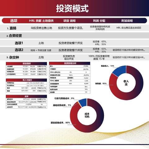 1. 直销 向投资者出售土地 投资方负责整个项目。 投资者保留所有利润 HRL 在出售后退出该项目